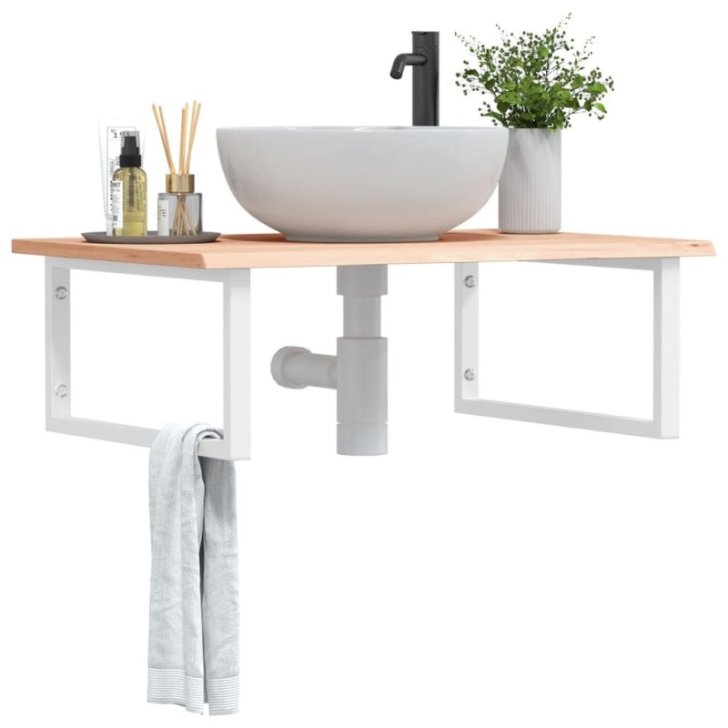 L'étagère murale pour vasque se fixe solidement au mur, offrant une solution élégante et peu encombrante pour votre salle de bains. Robuste et durable : cette étagère de lavabo est associée à une structure en acier et à un plateau en bois de chêne massif, ce qui la rend robuste, stable et durable.Gain de place : l’étagère flottante du lavabo offre suffisamment d’espace pour ranger les crèmes et les petits articles. Grâce à la forme rectangulaire, vous pouvez accrocher des serviettes ou d’autres choses sur le support pour gagner de la place.Facile à utiliser : le plan de travail n'est pas percé, ce qui permet d'installer la vasque à gauche, à droite ou au centre, selon les besoins de la pièce. Grâce aux trous pré-percés dans le support, il peut être facilement assemblé avec le plateau de table et fixé au mur.Multifonctionnel : grâce à son design moderne, il offre un espace supplémentaire pour différents types de salles de bains. Bon à savoir :Les vis ne sont pas incluses, vous pouvez les acheter séparément en fonction des informations fournies ci-dessous.Fixation murale : vis d'expansion M8 de 2 pcs par supportDessus en bois : vis M5x18 (T=2) de 2 pcs ou vis M5x20 (T=2,5/4cm) de 2 pcs par support.En tant que produit naturel, le bois peut présenter des nœuds et des imperfections que nous remplissons avec des garnitures noires pour garantir un aspect lisse.